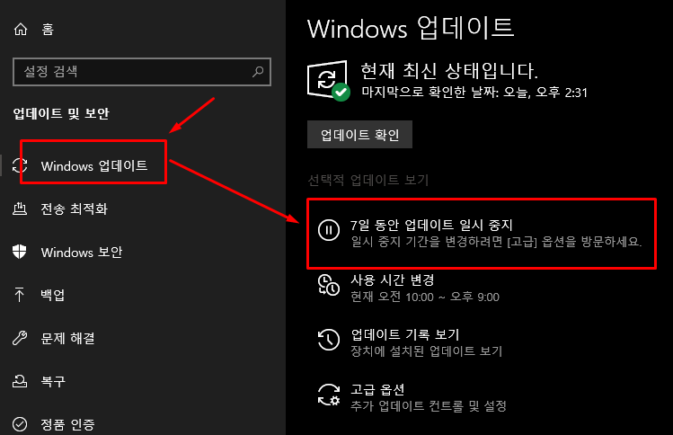 7일 동안 업데이트 일시 중지를 선택하는 것으로 당분간 윈도우 자동 업데이트로 방해를 받을 일은 없어지게 됩니다.