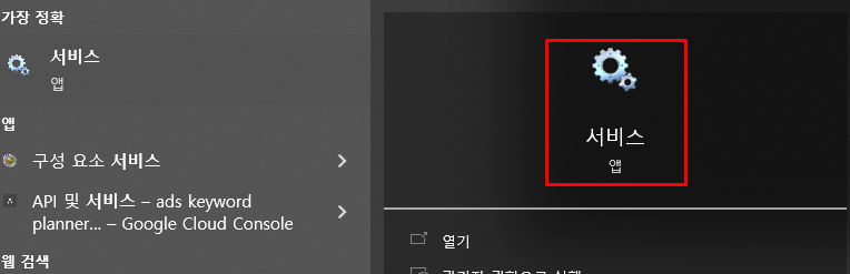 해당 방법은 확실하게 윈도우10 자동 업데이트 기능을 정지시키는 방법입니다. 서비스 앱을 이용해, 등록된 윈도우 업데이트 기능의 설정을 변경합니다. 수동 / 끄기 / 자동 등의 선택지로 설정을 할 수 있습니다. 작업표시줄의 검색바에서 '서비스'를 검색하여 실행합니다.