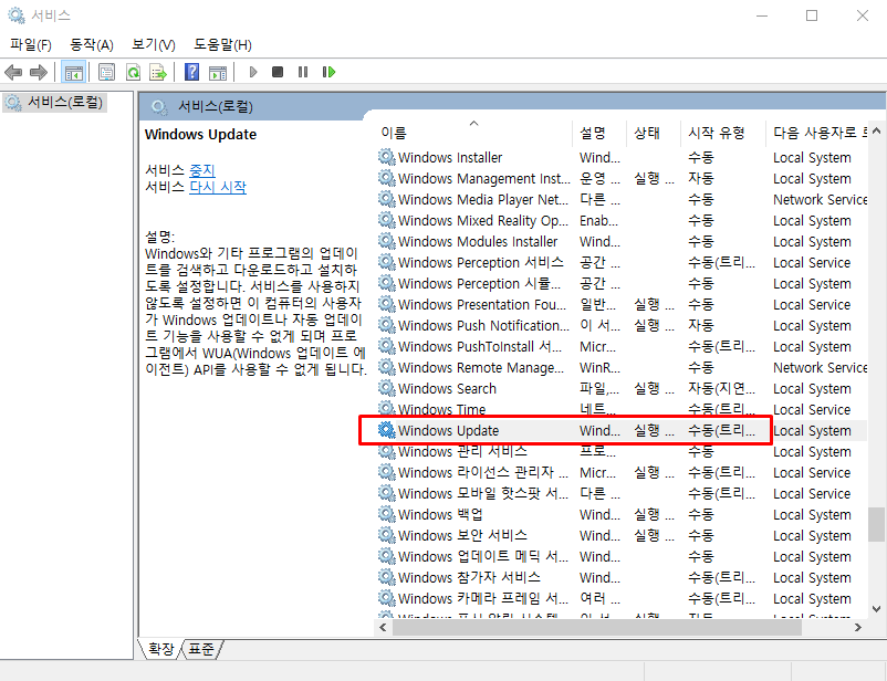 서비스에는 다양한 프로그램이 등록되어 있습니다. 오른쪽 표시창에서 'Windows Update'를 찾습니다.