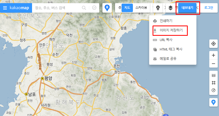 흔히 다음 지도 또는 카카오맵을 이용하여 길찾기, 스카이뷰, 로드뷰등을 활용할 것 입니다. 특히, 국내 여행을 위해 정보를 얻는 방법으로 지도의 활용도는 상당히 크다고 할 수 있겠죠. 해당 지도 서비스에서 지원하는 기능 중 '내보내기'가 있습니다. 인쇄하기 / 이미지 저장하기 / url 복사하기 / HTML 태그 복사 / 메일로 공유의 기능을 제공하고 있습니다. 다운로드를 위해서는 이미지 저장하기를 선택하면 되겠죠.