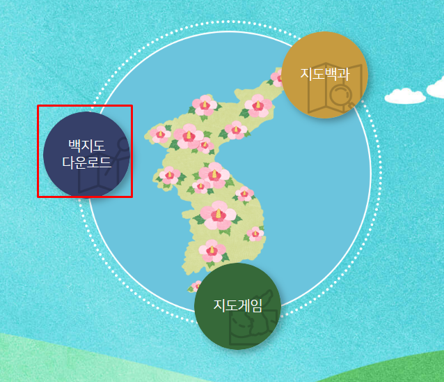 국토지리정보원 홈페이지에서 '어린이지도여행'을 선택합니다. 해당 페이지의 하단에는 백지도 다운로드 / 지도백과 / 지도게임의 3가지 메뉴가 있습니다. 백지도 다운로드를 선택합니다.