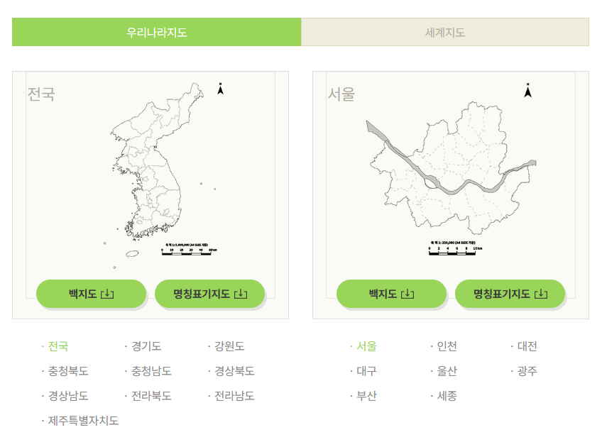 백지도를 다운로드할 수 있는 페이지로 이동하게 됩니다. 여기서 '우리나라 지도', '세계지도'의 2가지 큰 분류가 있습니다. 세부항복으로 지역을 선택할 수 있으며, 명칭이 표기된 지도를 선택할 수 있습니다.