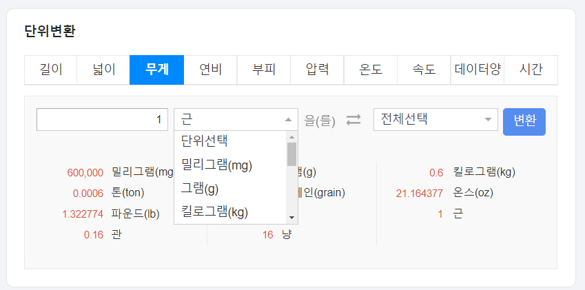 1. 다음 검색을 통해 1근을 검색해 봅니다. 단위 변환 기능을 이용해 여러 단위로 환산한 결과를 확인할 수 있습니다.