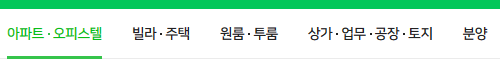 네이버 부동산에는 물건을 여러 카테고리로 나누고 있습니다. '아파트/오피스텔, 빌라/주택, 원룸/투룸, 상가/업무/공장/토지, 분양'의 큰 카테고리가 있습니다. 여기에서는 또 다시 세부 분류로 나뉘게 됩니다.