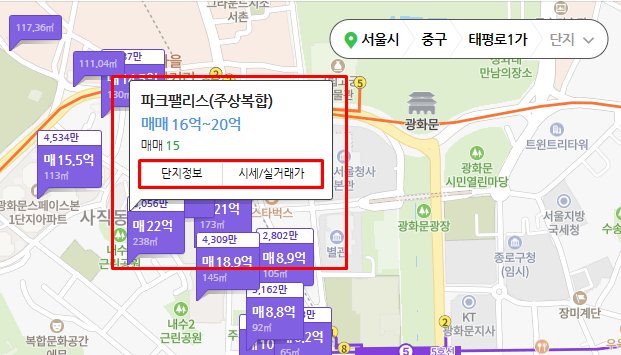 단지 정보 및 시세 / 실거래가 버튼을 선택하면 해당 물건에 대한 상세 내용이 포함된 페이지로 이동됩니다. 해당 페이지에서 더 많은 정보를 얻어 활용하는데 도움이 될 수 있습니다.