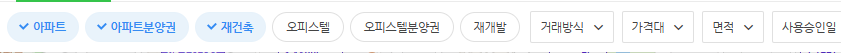 상단 메뉴바에서 큰 카테고리(아파트 / 오피스텔)을 선택하면 바로 아래 위 사진과 같이 세부 항목들이 등장합니다. 물건의 종류가 많은 만큼 다양한 조건으로 검색을 진행할 수 있습니다.
